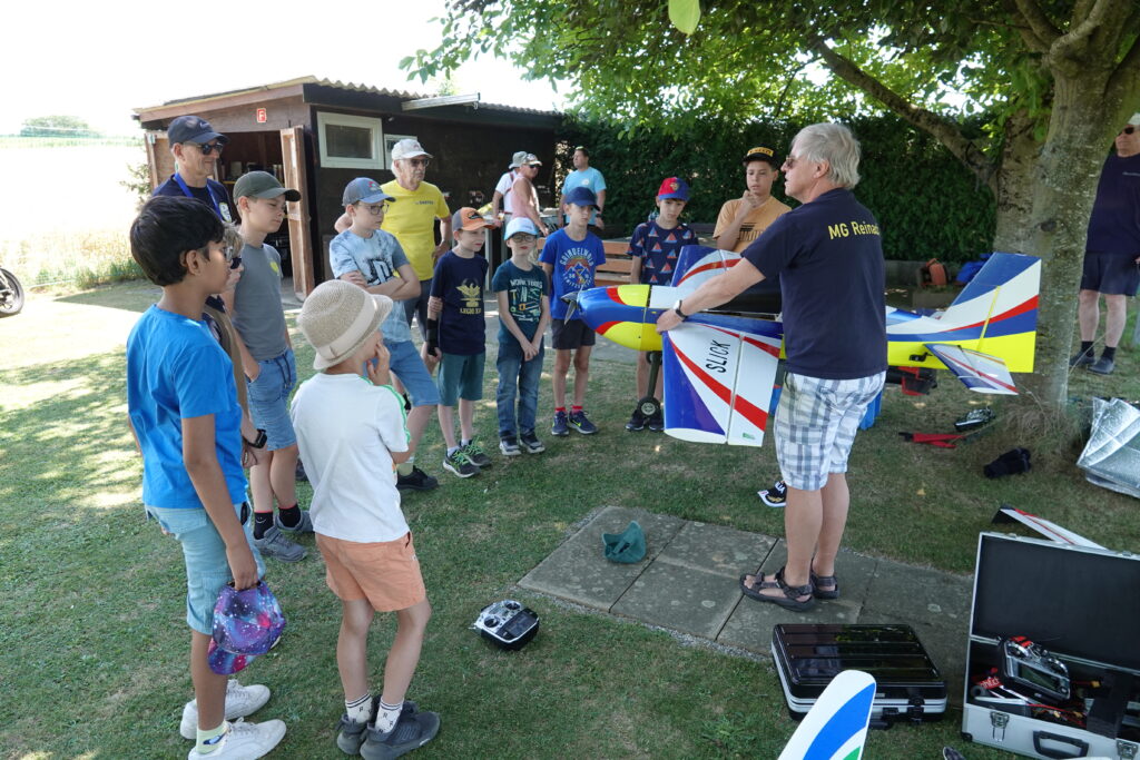 Kaum waren die Kinder angekommen brach ein grosses Staunen und Stimmengewirr aus – duzende Fragen gleichzeitig: «wie schnell fliegt der?», «kann ich da reinsitzen?», «wie hoch fliegt er?» etc. Damit war der richtige Zeitpunkt für eine theoretische Einführung gekommen: Mit erstaunlicher Konzentration horchten sie den Ausführungen eines unserer Mitglieder und lernten, weshalb ein Flugzeug überhaupt fliegt, wie die Ruder an Tragfläche und am Heck auf die Knüppelbewegungen am Sender reagieren und was sie schliesslich während des Fluges bewirken. Die Aufmerksamkeit der angehenden Pilotenschüler war ungebrochen, wohlwissend, dass sie sehr bald selbst dran waren, die Steuerknüppel in die Hand zu nehmen.