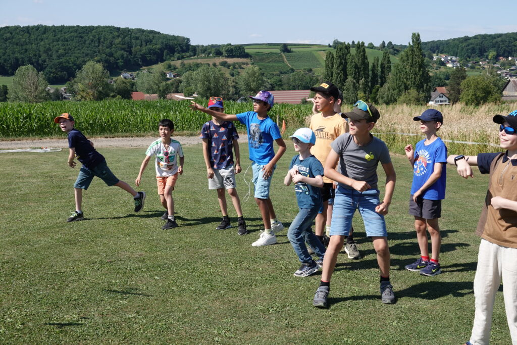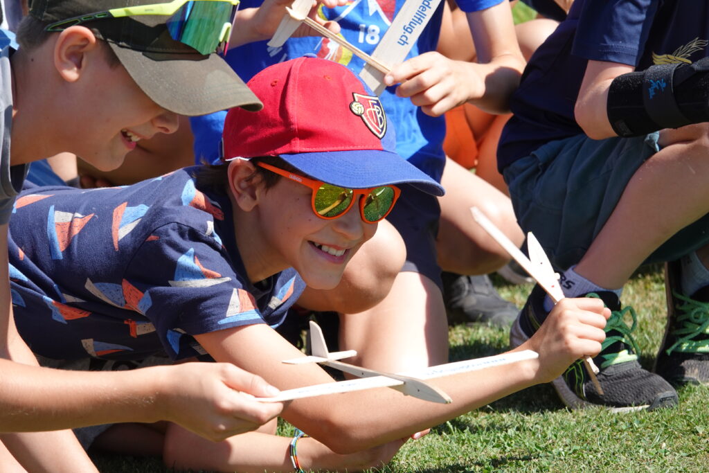 Inzwischen waren die kleinen Balsagleiter bereit zum Jungfernflug. Nach ein paar Probeflügen und etwas Nachjustieren der Flügel- und Leitwerkeinstellung traten die Jungen zum Wettkampf im Weitfliegen an. Die Freude an den selbstgebastelten Flugzeugen war gross. Umso grösser der Ehrgeiz, den eigenen Flieger so einzustellen, dass er am weitesten flog und möglichst lange in der Luft blieb.