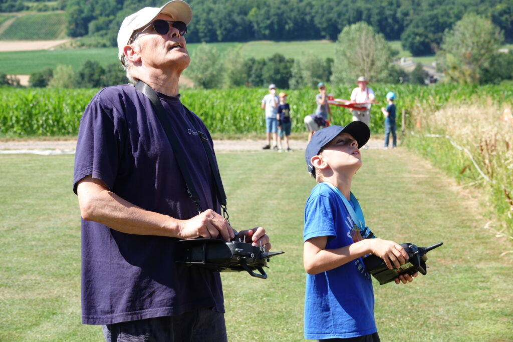 Bei der zweiten Gruppe stieg die Spannung merklich, denn jetzt war für sie fliegen mit Lehrer-Schüler-Fernsteuerung angesagt. Trotz einer bei den herrschenden Temperaturen zwar angenehmen, für die Piloten allerdings recht herausfordernden Brise, kreisten bald 5 kleine und auch grosse Flugmodelle gleichzeitig am Himmel. Die anfängliche Vorsicht und Anspannung der jungen Flugschüler wichen mit jedem Flug einer sichtbaren Begeisterung. Das Selbstvertrauen wuchs, und die Flugbewegungen wurden harmonischer und dann auch etwas gewagter. Immer wieder hörten wir: «Kann ich jetzt ein Looping machen?»